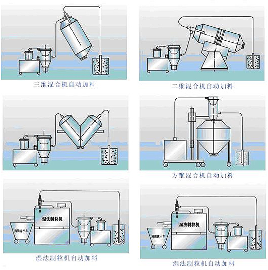 現(xiàn)在多數(shù)制藥廠V型混合機、三維運動混合機靠人工裝料,工人勞動強度大,粉塵外溢,生產(chǎn)車間無法通過GMP認證。混合機自動上料機徹底解決了這一難題。它不需外接真空。不需要壓縮空氣,粉料、顆粒料都能自動進入各種混合機。該機由吸料嘴、布袋過濾器、振打清理器和真空泵組成整套系統(tǒng)設計合理,制造精美,拆裝方便,符合要求。
